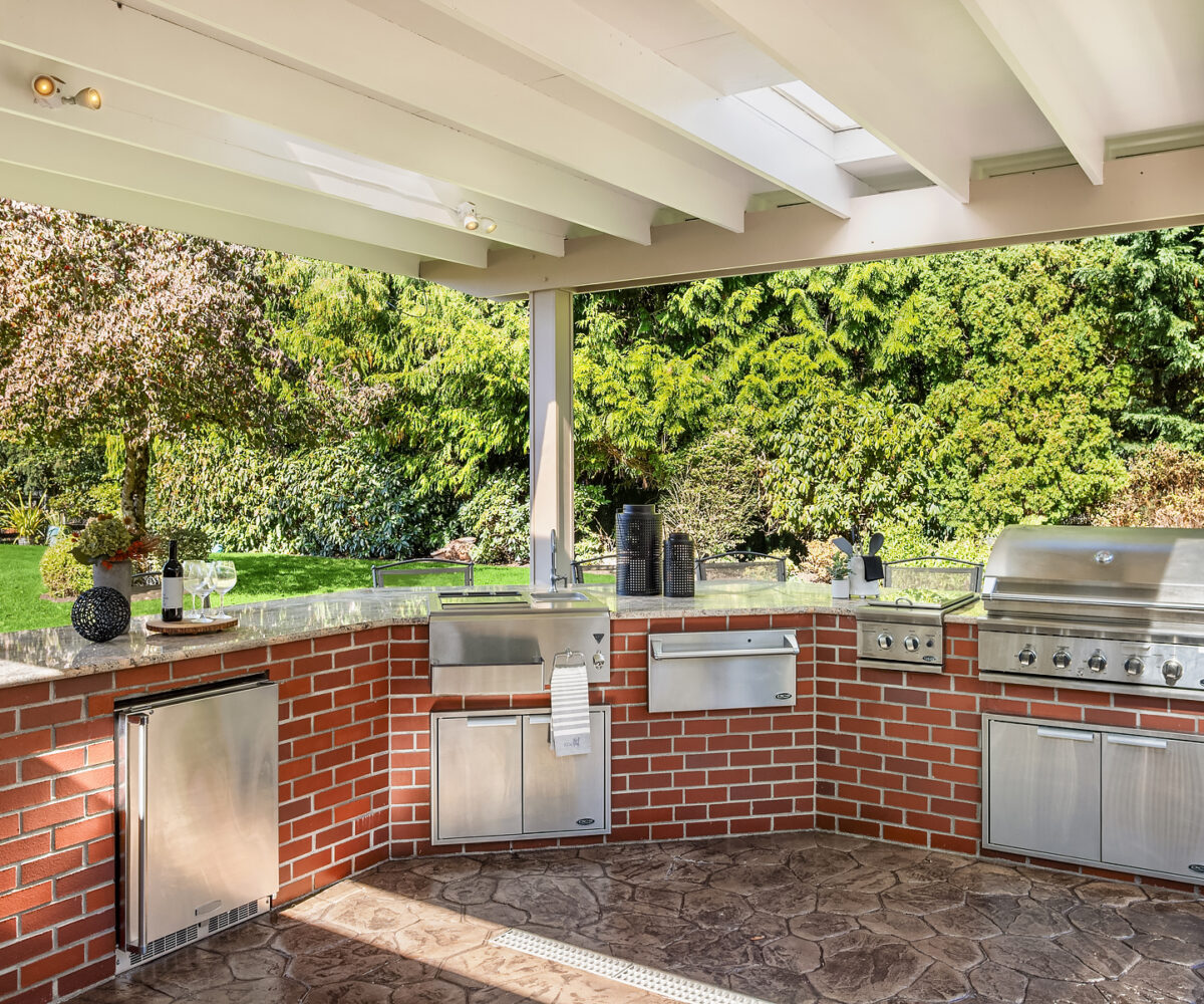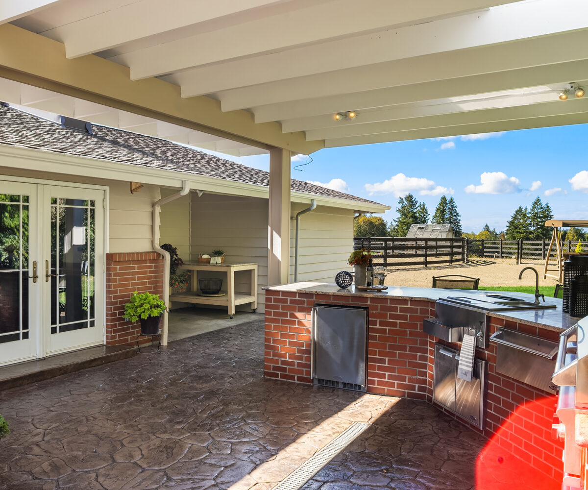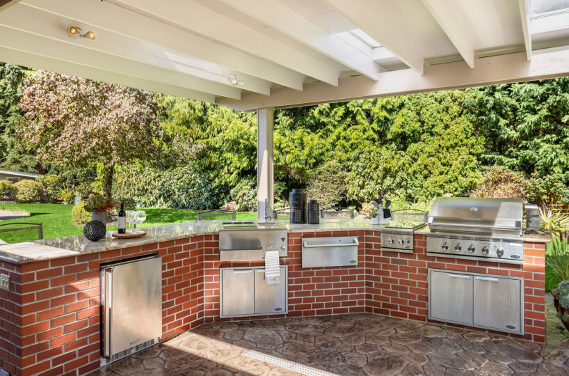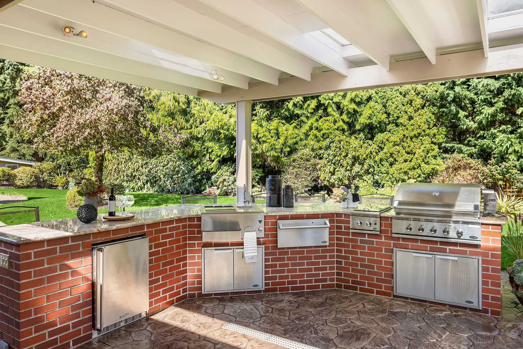 - Covered outdoor living with grand scale custom-built outdoor kitchen