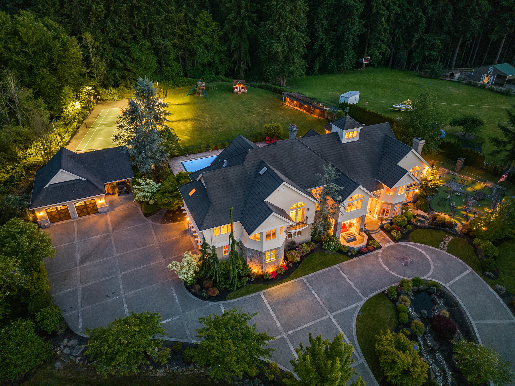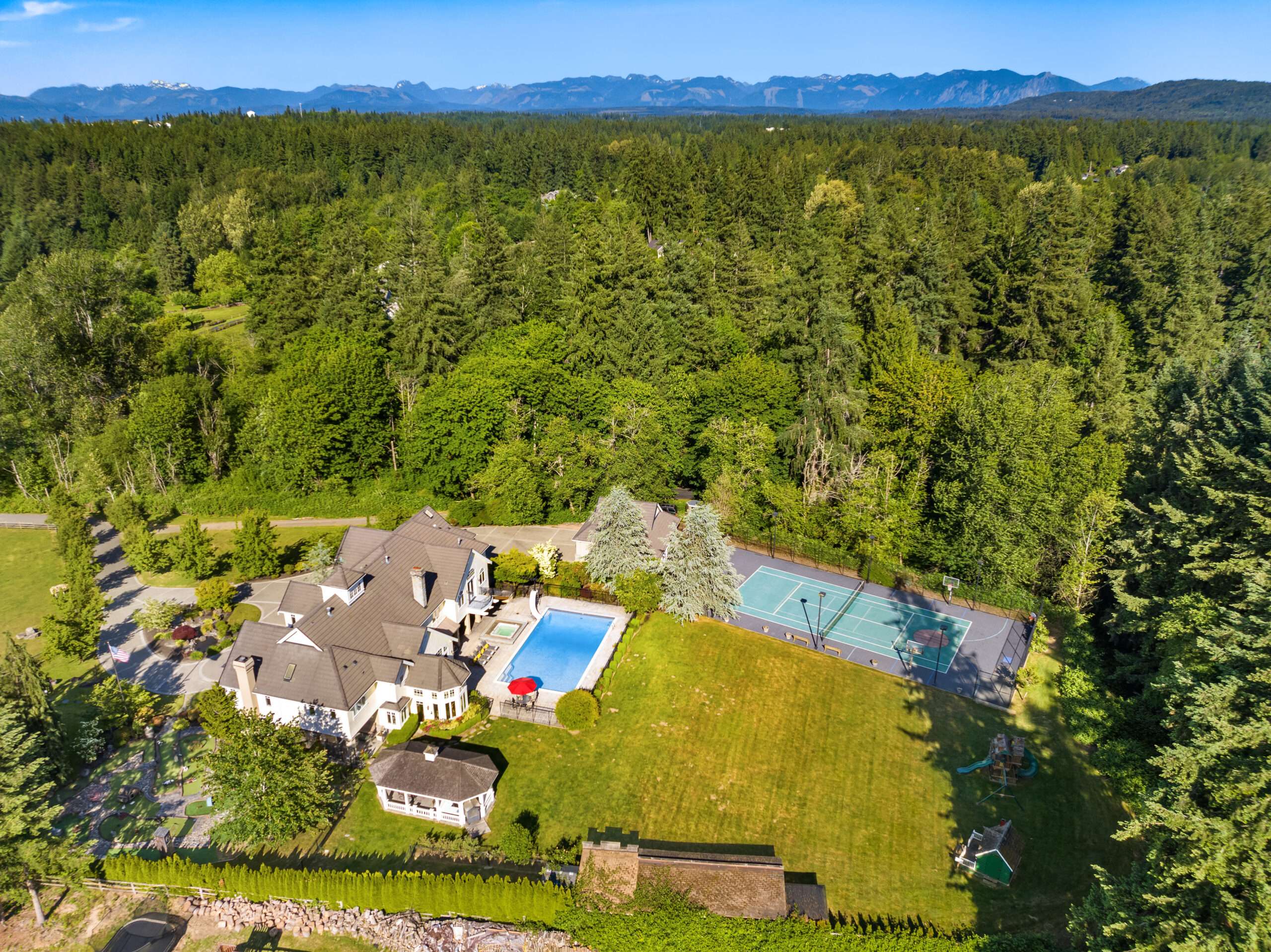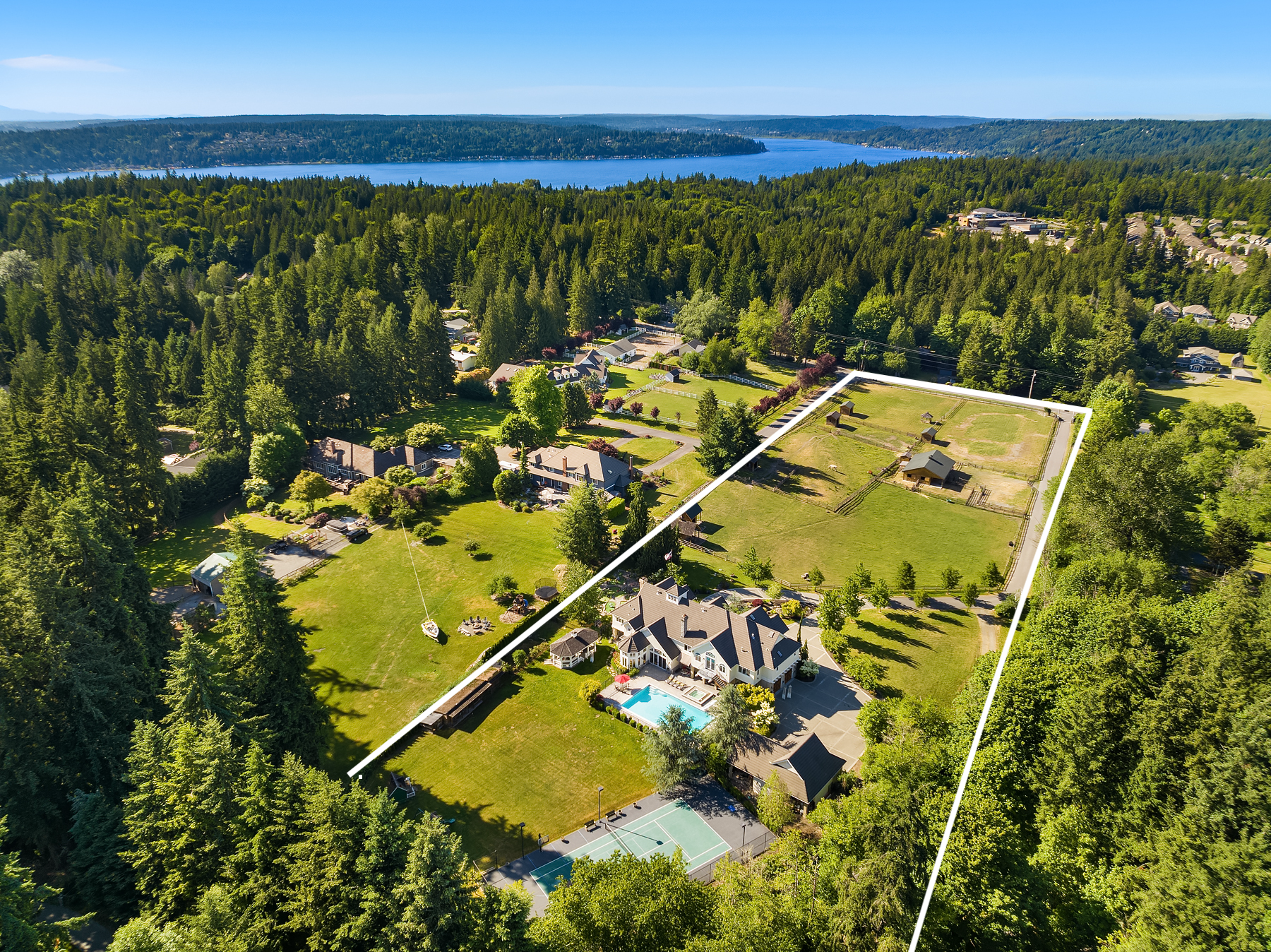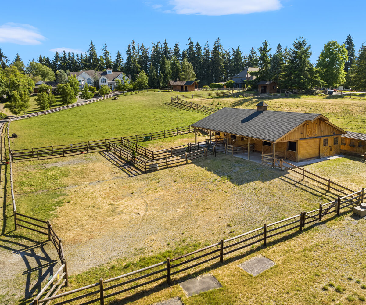 Welcome to a timeless masterpiece by Odegard Gockel, nestled in the heart of the Sammamish Plateau. This exceptional estate blends casual equestrian charm with refined luxury across nearly 6 acres of usable land. The 6,550 sq ft home offers a seamless layout, featuring formal and great room living spaces, a tranquil waterfall entry, and expansive amenities including a sparkling in-ground pool, full tennis/sport court, and private putt-putt golf. Equestrian components include 4 stall barn, wood rail fenced and cross fenced pastures, paddocks, storage, additional loafing sheds and outbuildings. Crafted by a Street of Dreams builder, this estate is a rare fusion of elegance and versatility. Whether your lifestyle calls for privacy, space for horses or farm animals, or simply relaxing poolside, this property delivers boundless opportunities—all just minutes from I-90 and in city conveniences.