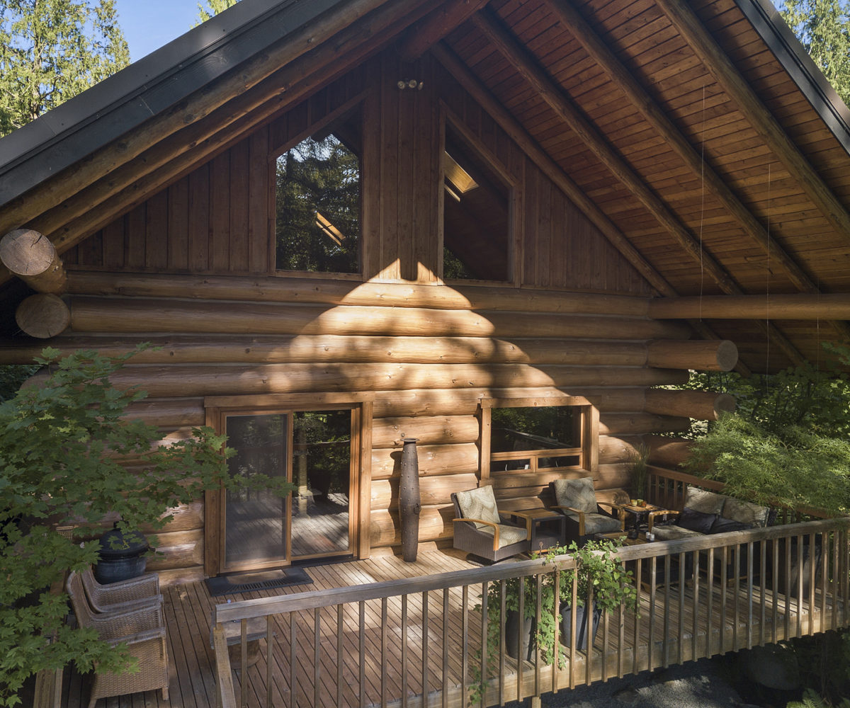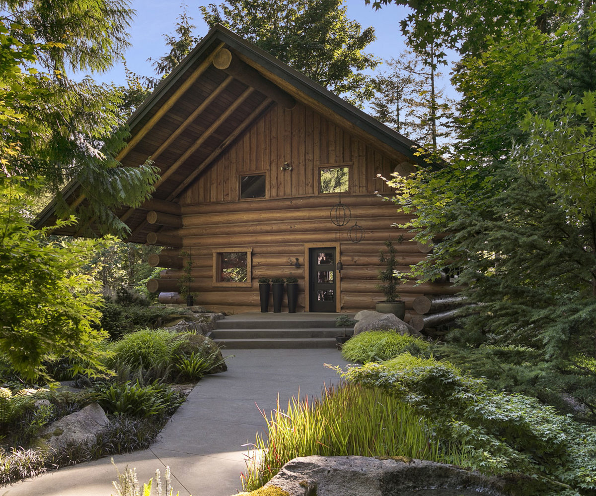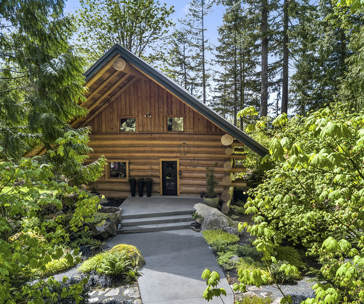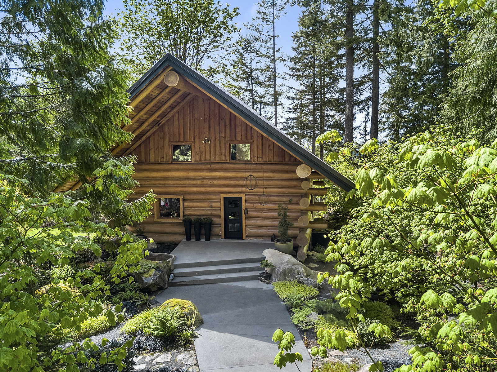 Sophisticated Log home living meets Modern! Comfortable, inviting spaces brought to life w/ on-site harvested fir logs & hand-crafted construction. Thoughtful blends of Wood, glass, stone and artful landscape create a Zen-like retreat that you can call home. Massive covered overhangs for year-round outdoor enjoyment, chefs kitchen with custom glass bar, spa master bath and radiant heated floors thru-out. Privacy, treasured gardens & grounds and, tremendous garage/shop with ADU potential above.