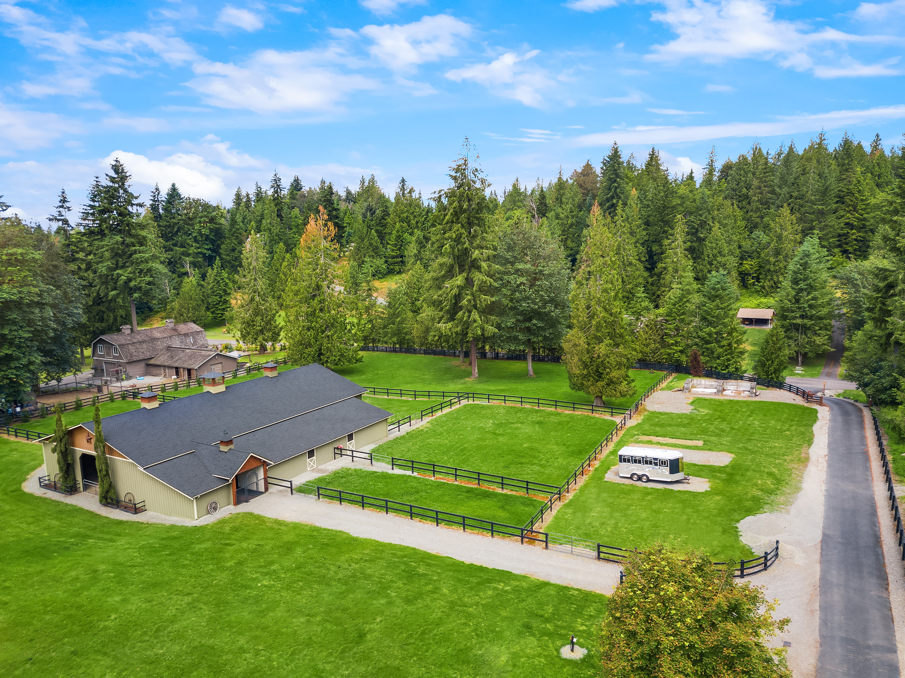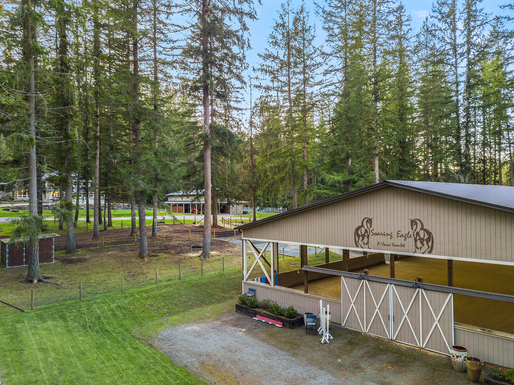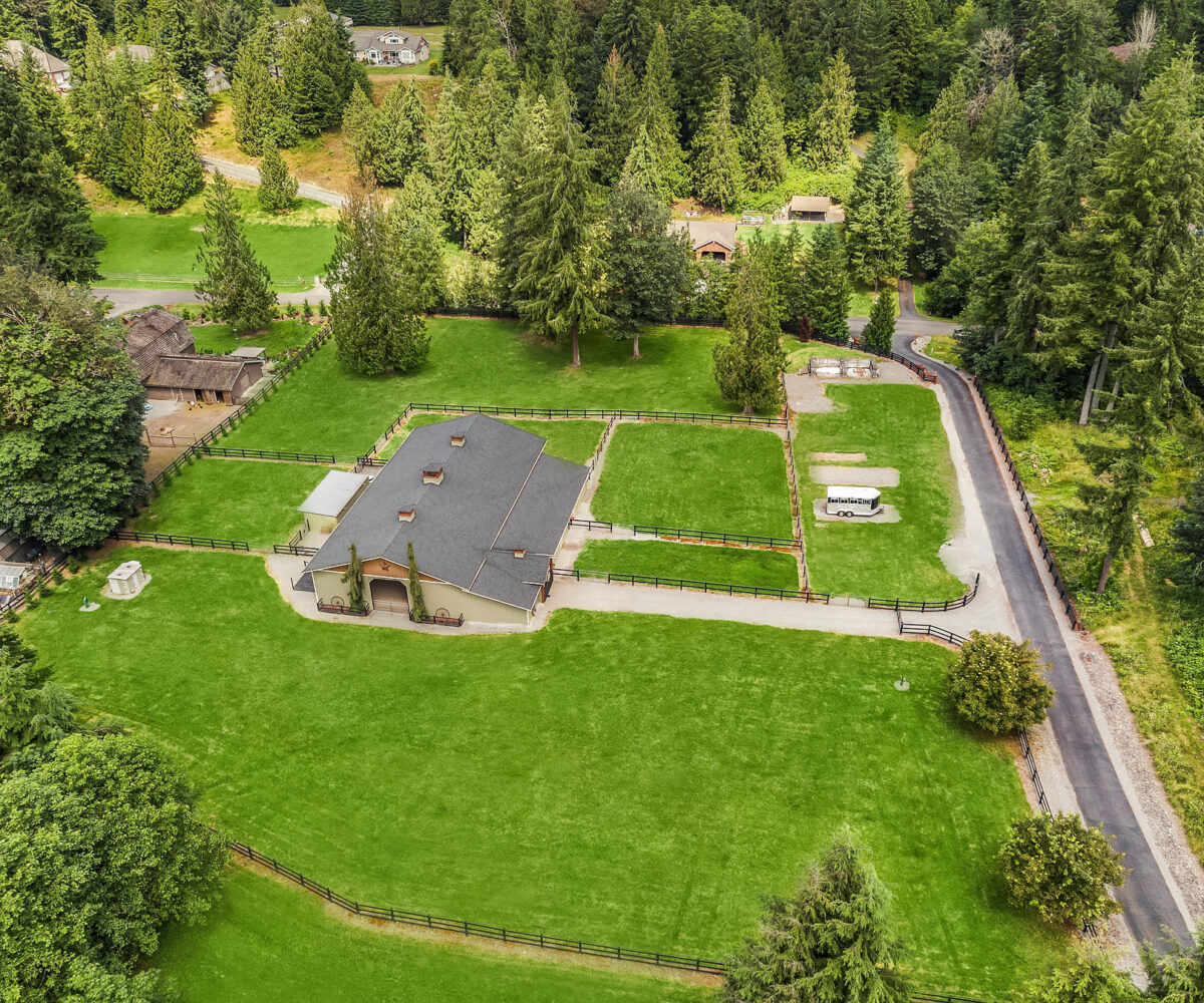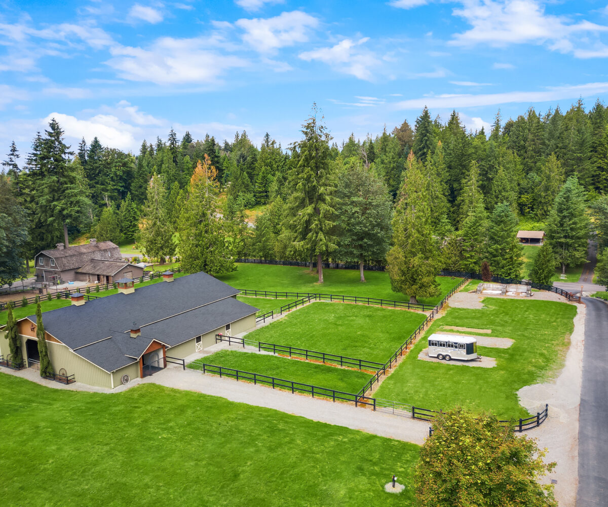 Fine Equestrian living located in idyllic Redmond location adjoining Soaring Eagle Park. Updated custom home with main floor primary suite, 5 piece spa stone bath & Chefs slab kitchen. Great Room design with fireplace, multiple French doors to deck with formal dining & living rooms. Dual staircase, Hardwoods throughout main level, bonus room up & pastoral views from most rooms. Matching 5 stall barn with paddocks, heated tack room, wash rack, hay loft with 1/2 bath & finished studio, additional en-suite guest quarters with 3/4 bathroom. Sought after direct trail access to 600 acre Soaring Eagle Park, 80×120 Covered arena with quality no water footing, fenced and cross fenced pastures, loafing sheds and a superb location down dead-end paved road offering uncompromised privacy.