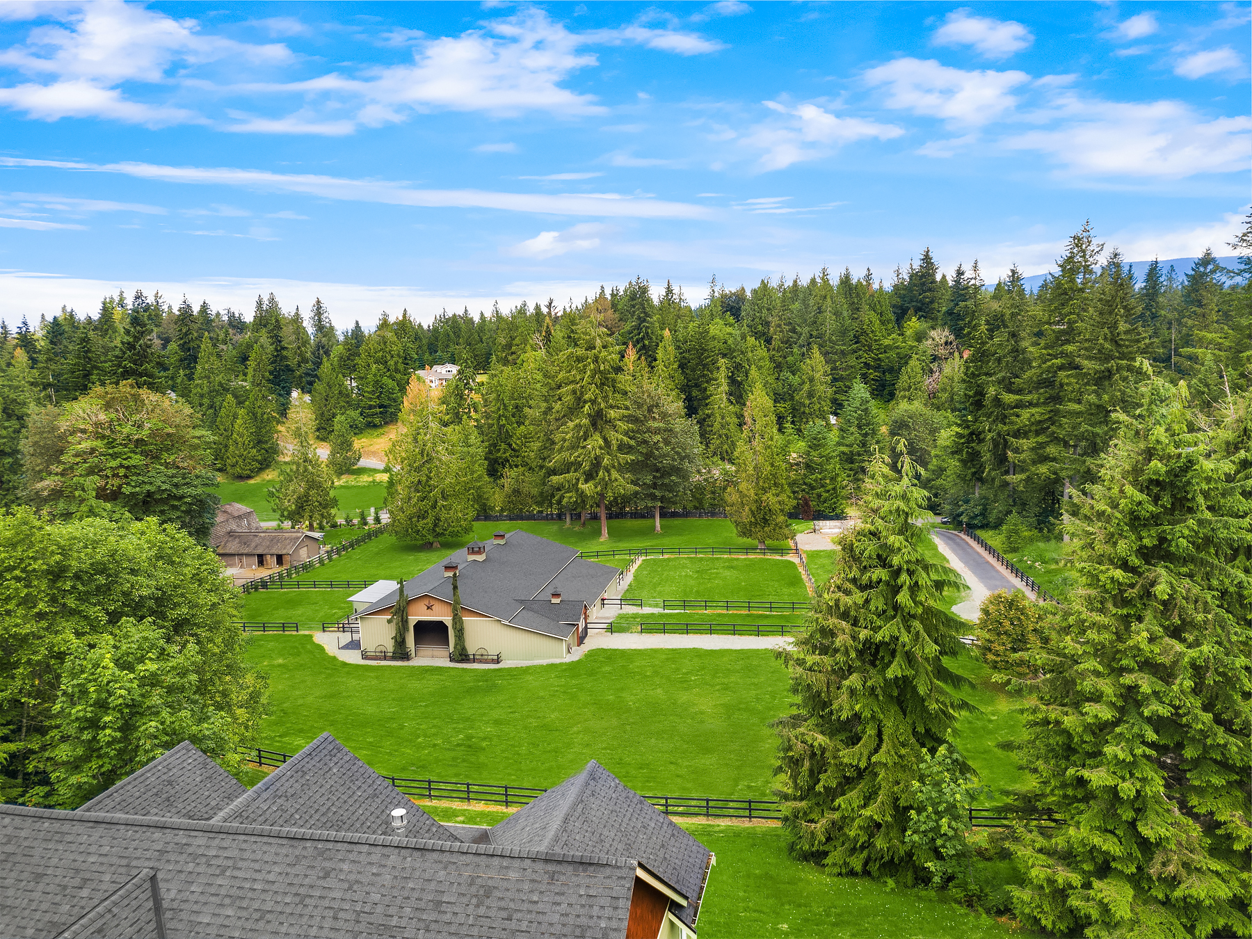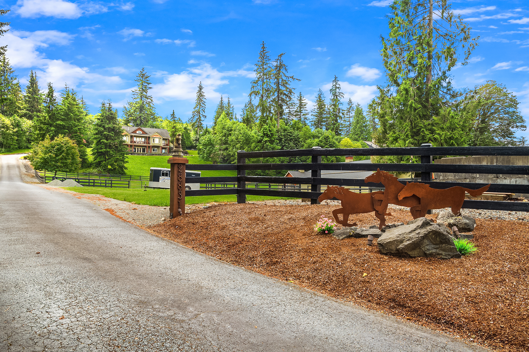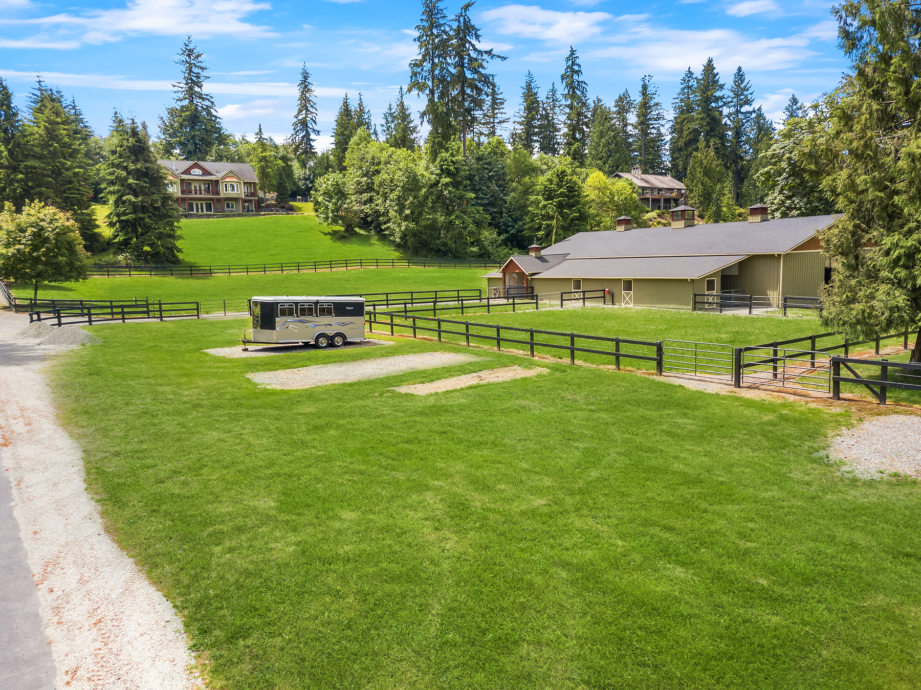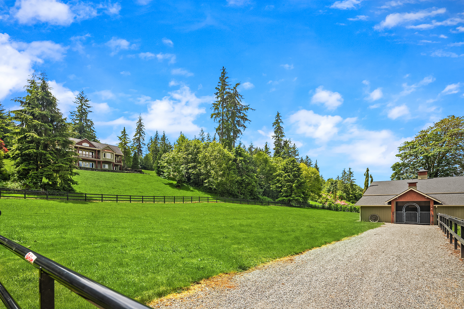 Fine Equestrian living located in idyllic Redmond location adjoining Soaring Eagle Park. Updated custom home with main floor primary suite, 5 piece spa stone bath & Chefs slab kitchen. Great Room design with fireplace, multiple French doors to deck with formal dining & living rooms. Dual staircase, Hardwoods throughout main level, bonus room up & pastoral views from most rooms. Matching 5 stall barn with paddocks, heated tack room, wash rack, hay loft with 1/2 bath & finished studio, additional en-suite guest quarters with 3/4 bathroom. Sought after direct trail access to 600 acre Soaring Eagle Park, 80×120 Covered arena with quality no water footing, fenced and cross fenced pastures, loafing sheds and a superb location down dead-end paved road offering uncompromised privacy.