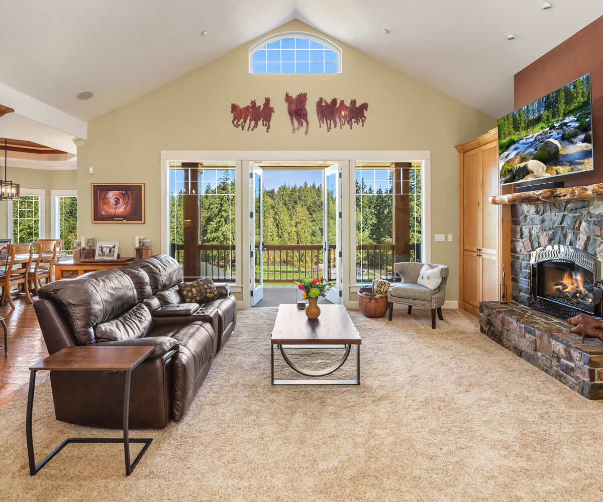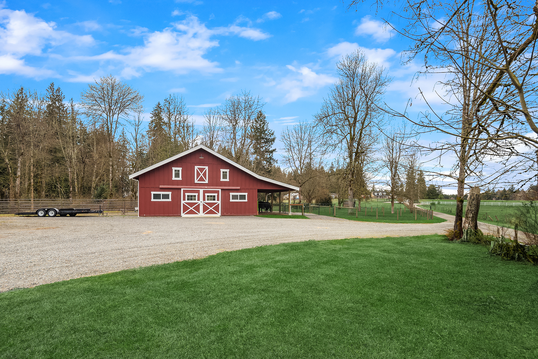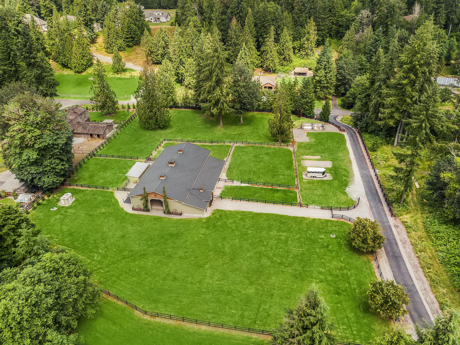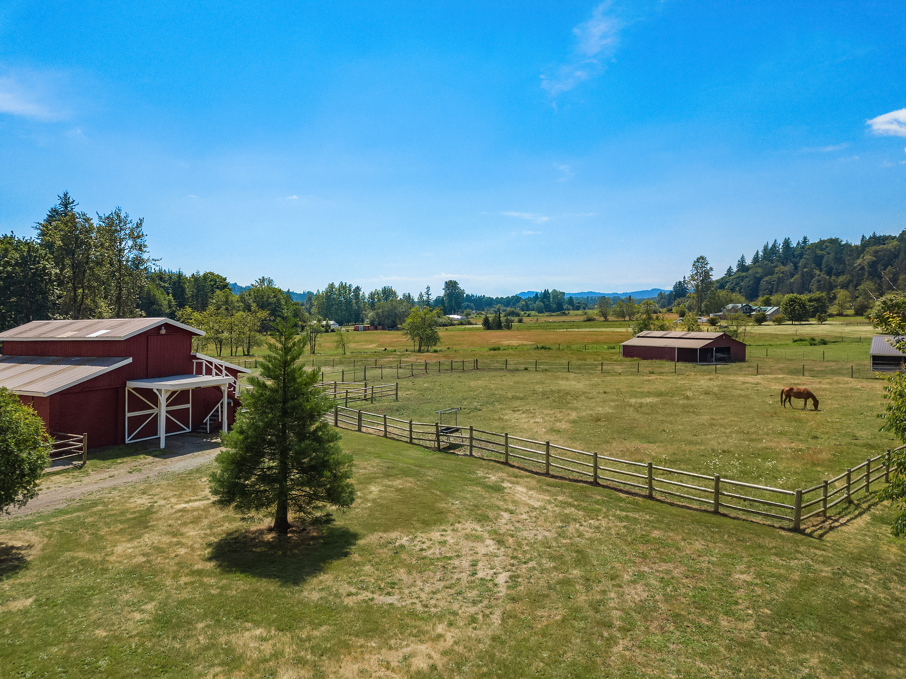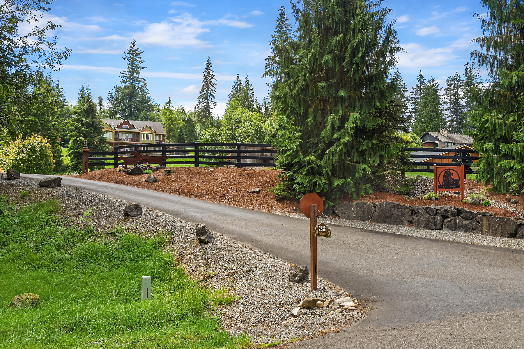 Fine Equestrian living located in idyllic Redmond location adjoining Soaring Eagle Park. Updated custom home with main floor primary suite, 5 piece spa stone bath & Chefs slab kitchen. Great Room design with fireplace, multiple French doors to deck with formal dining & living rooms. Dual staircase, Hardwoods throughout main level, bonus room up & pastoral views from most rooms. Matching 5 stall barn with paddocks, heated tack room, wash rack, hay loft with 1/2 bath & finished studio, additional en-suite guest quarters with 3/4 bathroom. Sought after direct trail access to 600 acre Soaring Eagle Park, 80×120 Covered arena with quality no water footing, fenced and cross fenced pastures, loafing sheds and a superb location down dead-end paved road offering uncompromised privacy.