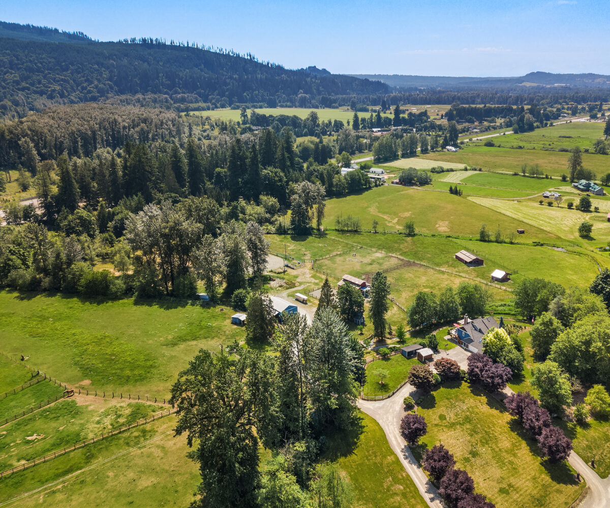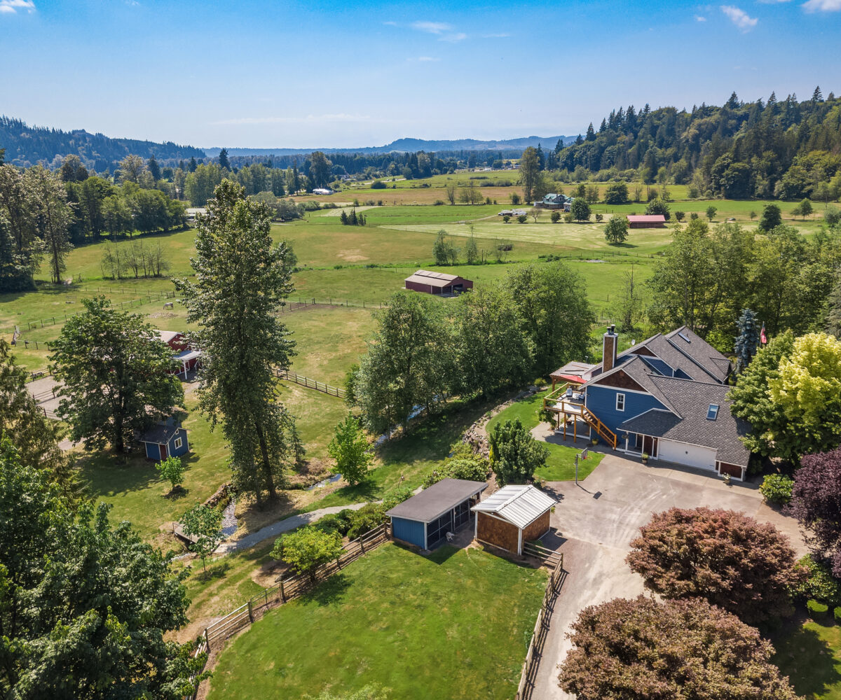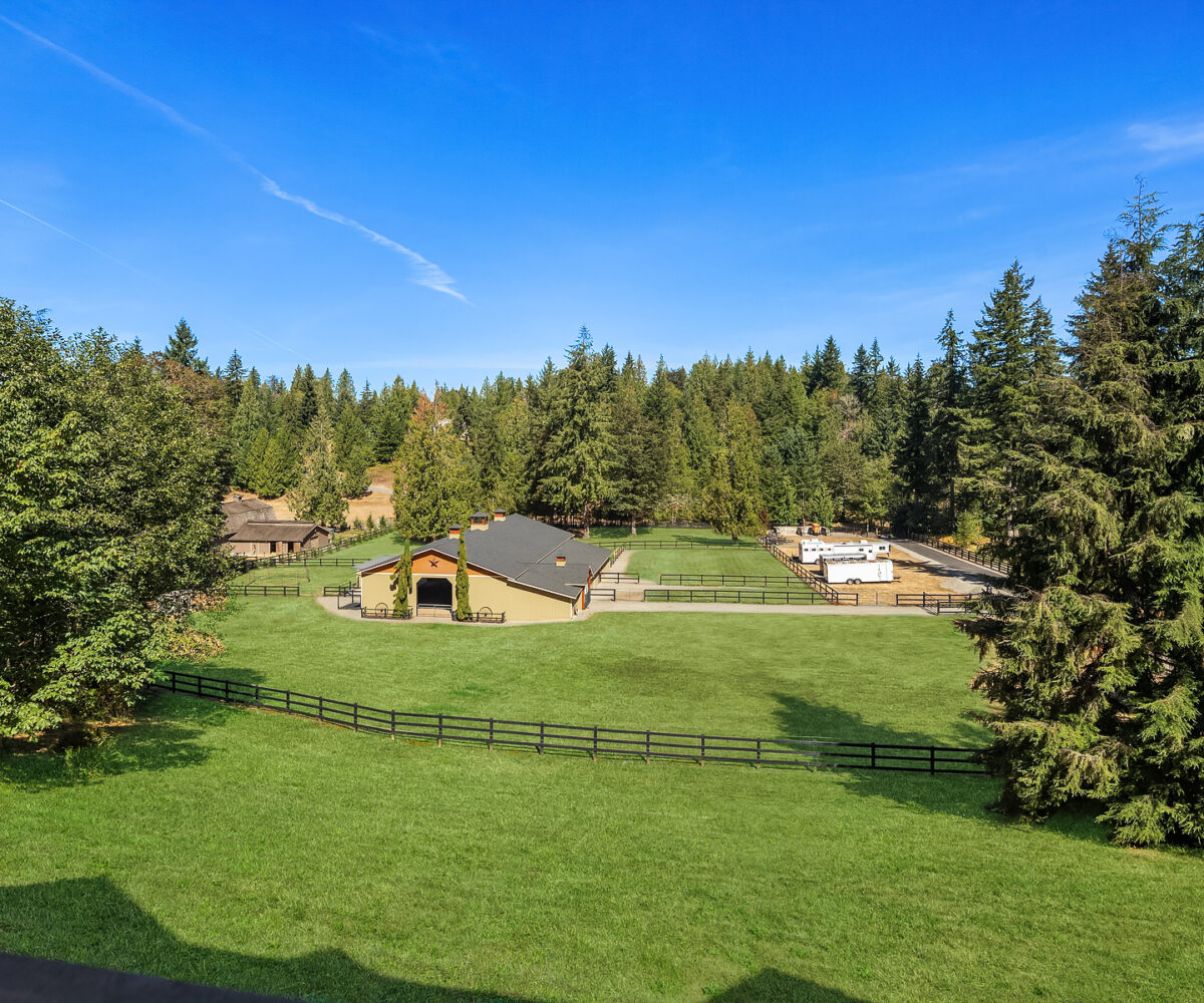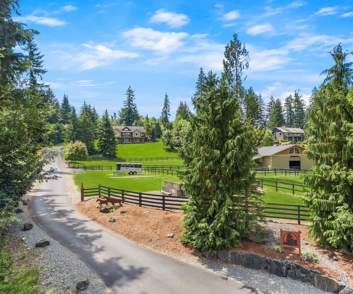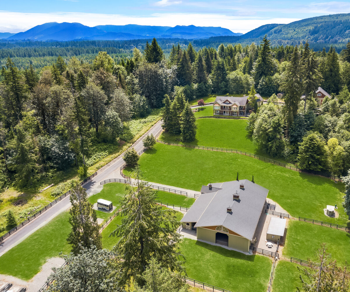 Dunn Bar Ranch in beautiful Enumclaw. Shy 20 acre horse facility with dual aisle-way barn and indoor arena! A Rare offering located on a wonderful street of Country Estates. One of a kind gated, fenced & cross fenced with multiple pastures and loafing sheds and a terrific 1/2 mile track, 20 stall barn with 2 aisle-ways, approximate 60 x 120 indoor arena, round pen, tack room, wash rack, Large office with 3/4 bath, feed room and 4 bay outbuilding/multipurpose shed. Property has been a training facility & suitable for boarding as well. 1999 Updated home with Great room, Hardwood floors, main floor primary suite & upper level bedrooms and basement. Gorgeous setting, lush pastures, fenced yard, terrific location!