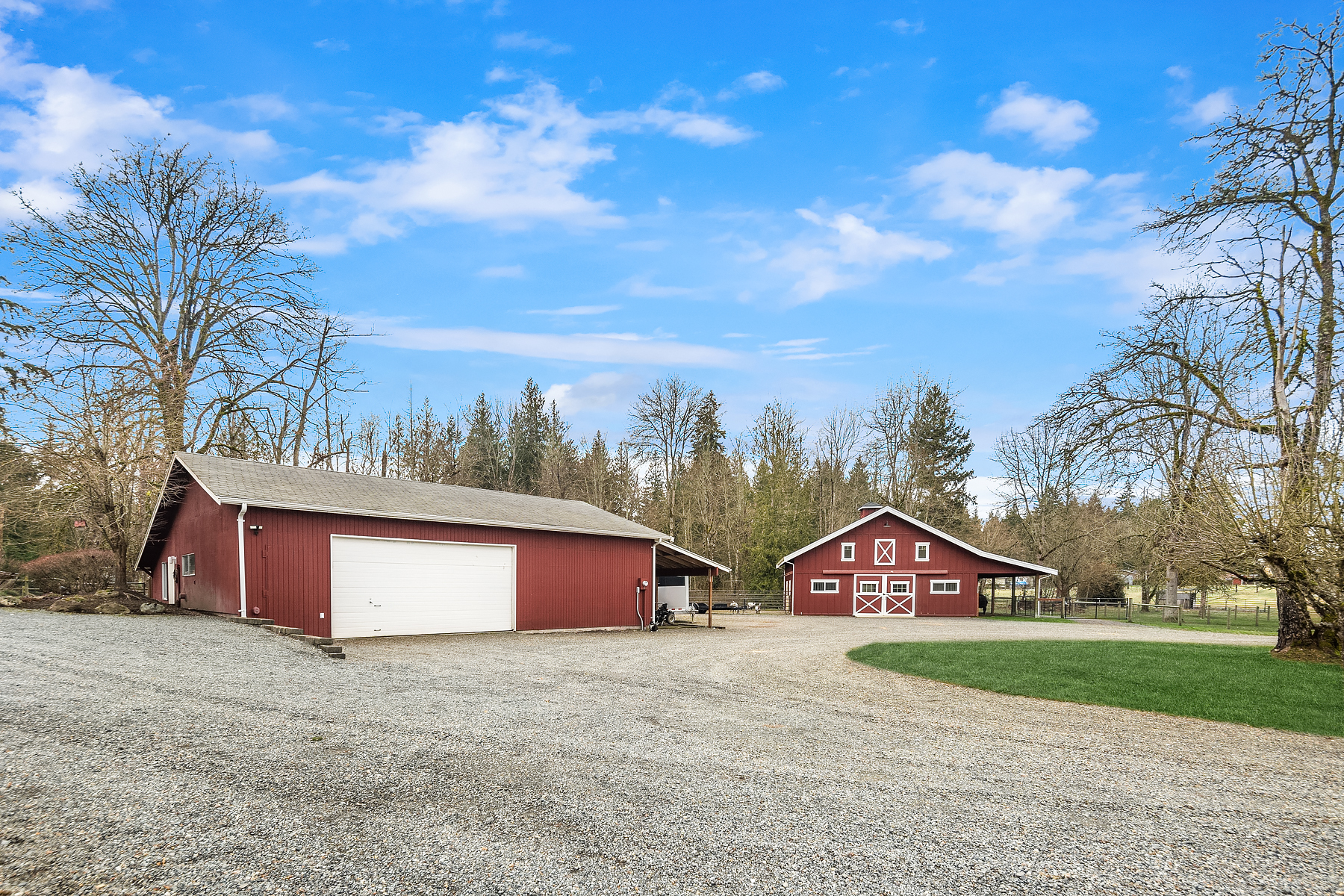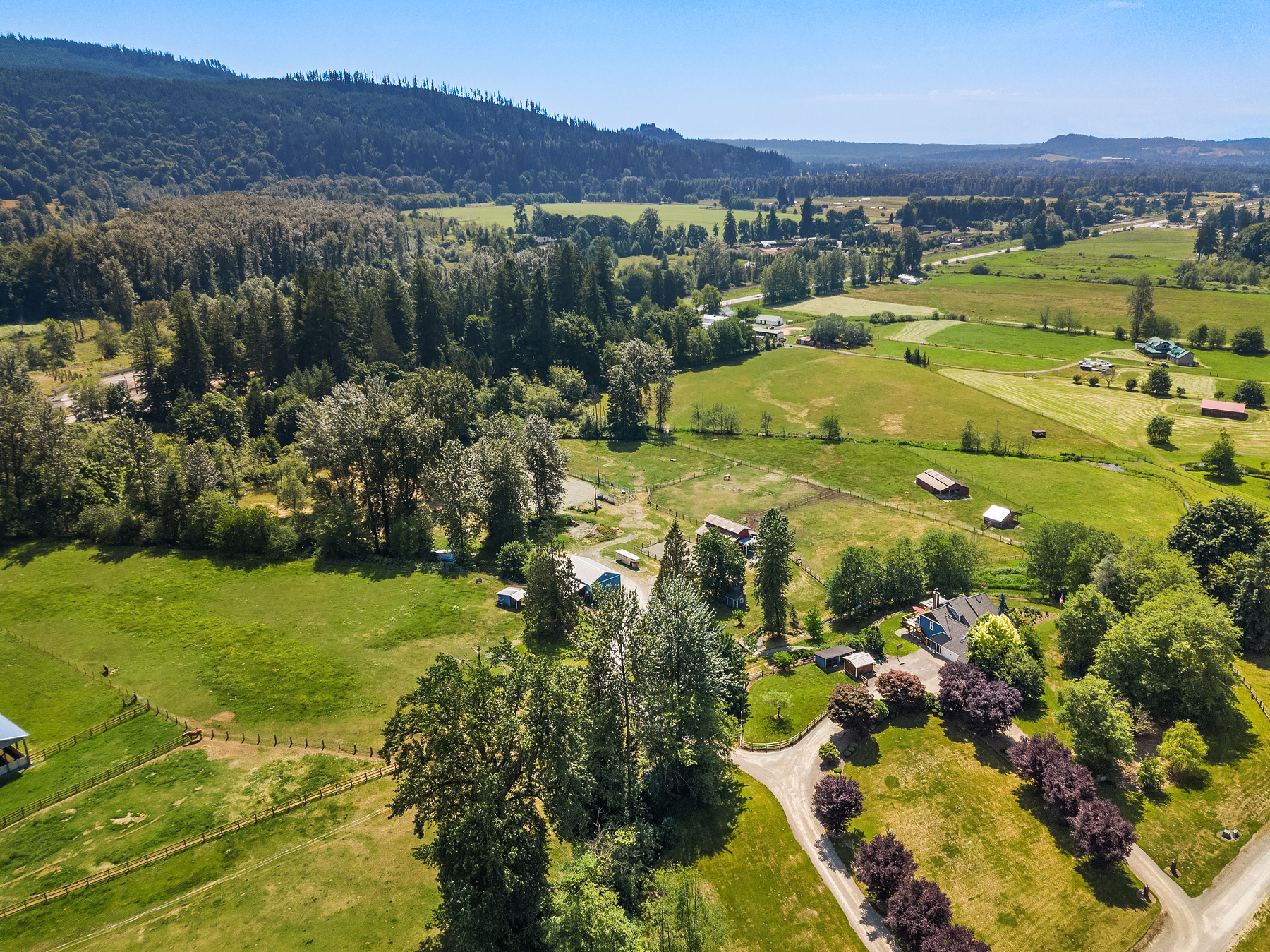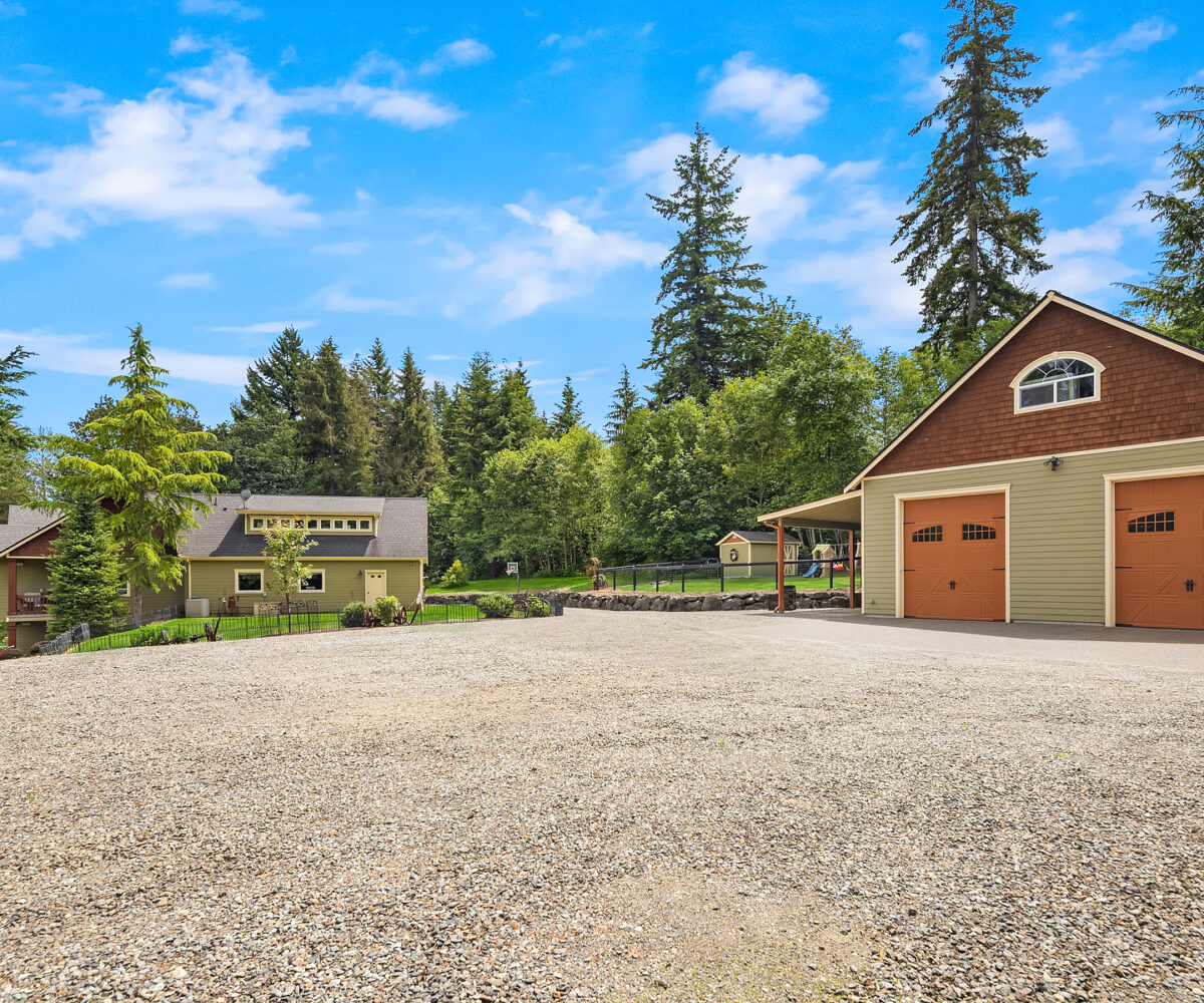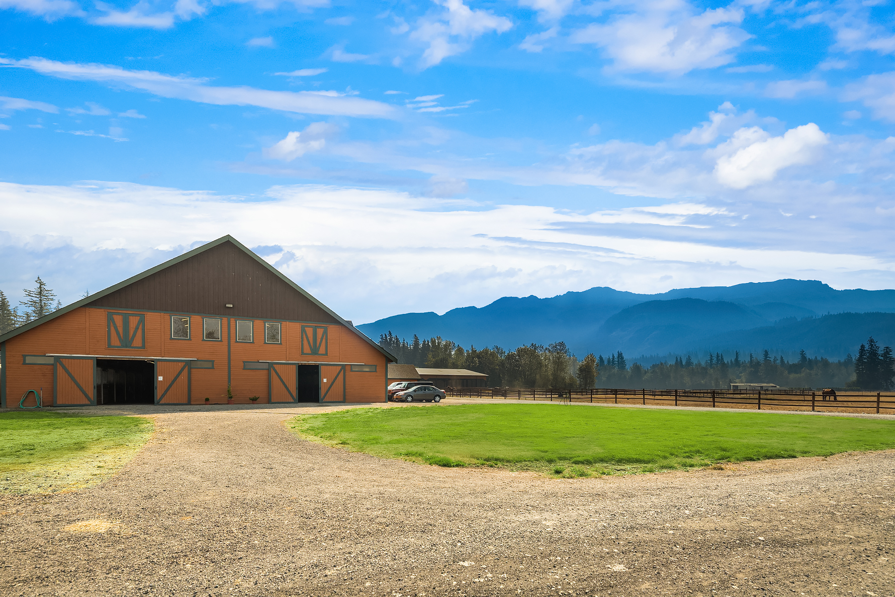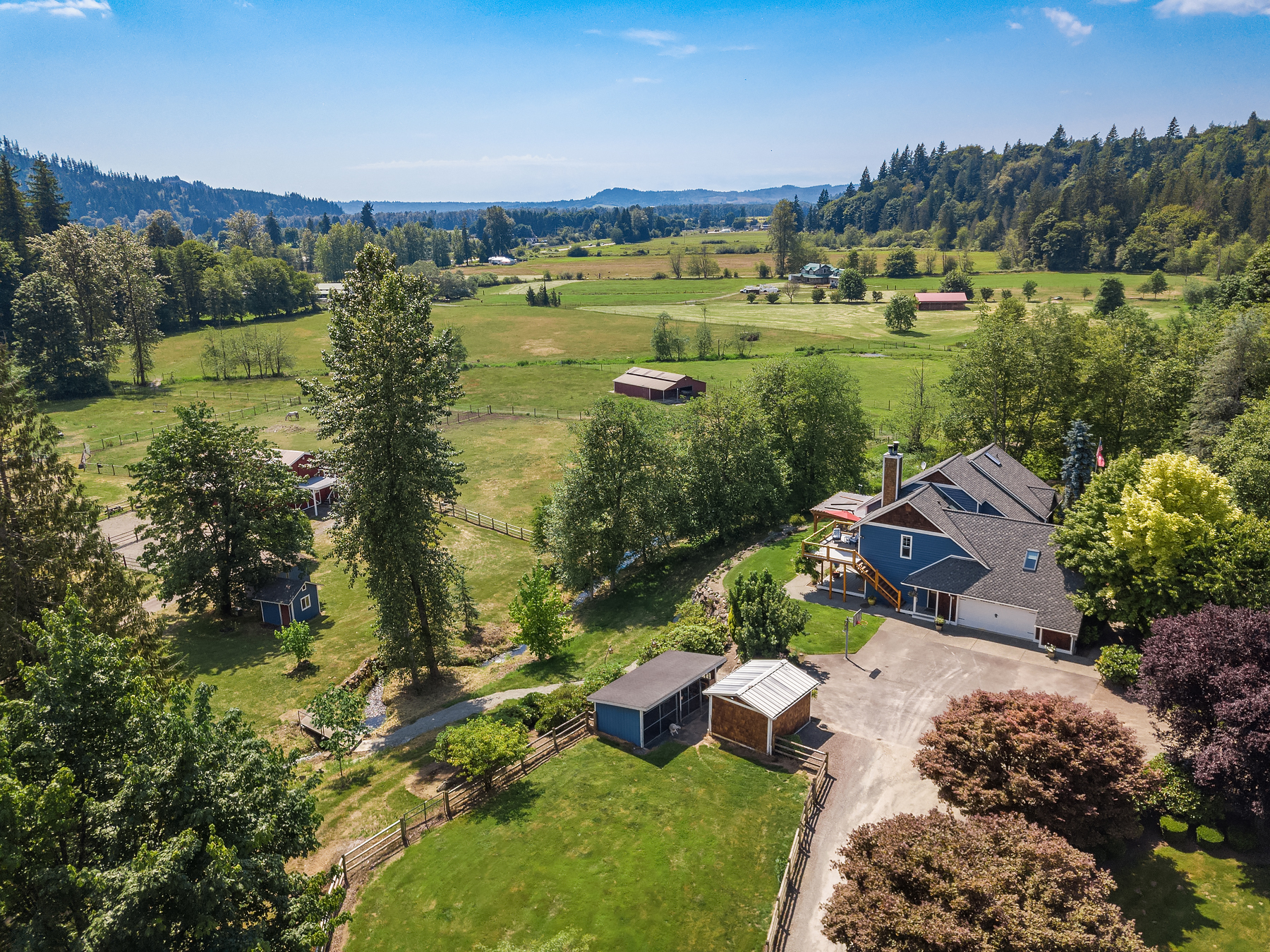 Dunn Bar Ranch in beautiful Enumclaw. Shy 20 acre horse facility with dual aisle-way barn and indoor arena! A Rare offering located on a wonderful street of Country Estates. One of a kind gated, fenced & cross fenced with multiple pastures and loafing sheds and a terrific 1/2 mile track, 20 stall barn with 2 aisle-ways, approximate 60 x 120 indoor arena, round pen, tack room, wash rack, Large office with 3/4 bath, feed room and 4 bay outbuilding/multipurpose shed. Property has been a training facility & suitable for boarding as well. 1999 Updated home with Great room, Hardwood floors, main floor primary suite & upper level bedrooms and basement. Gorgeous setting, lush pastures, fenced yard, terrific location!