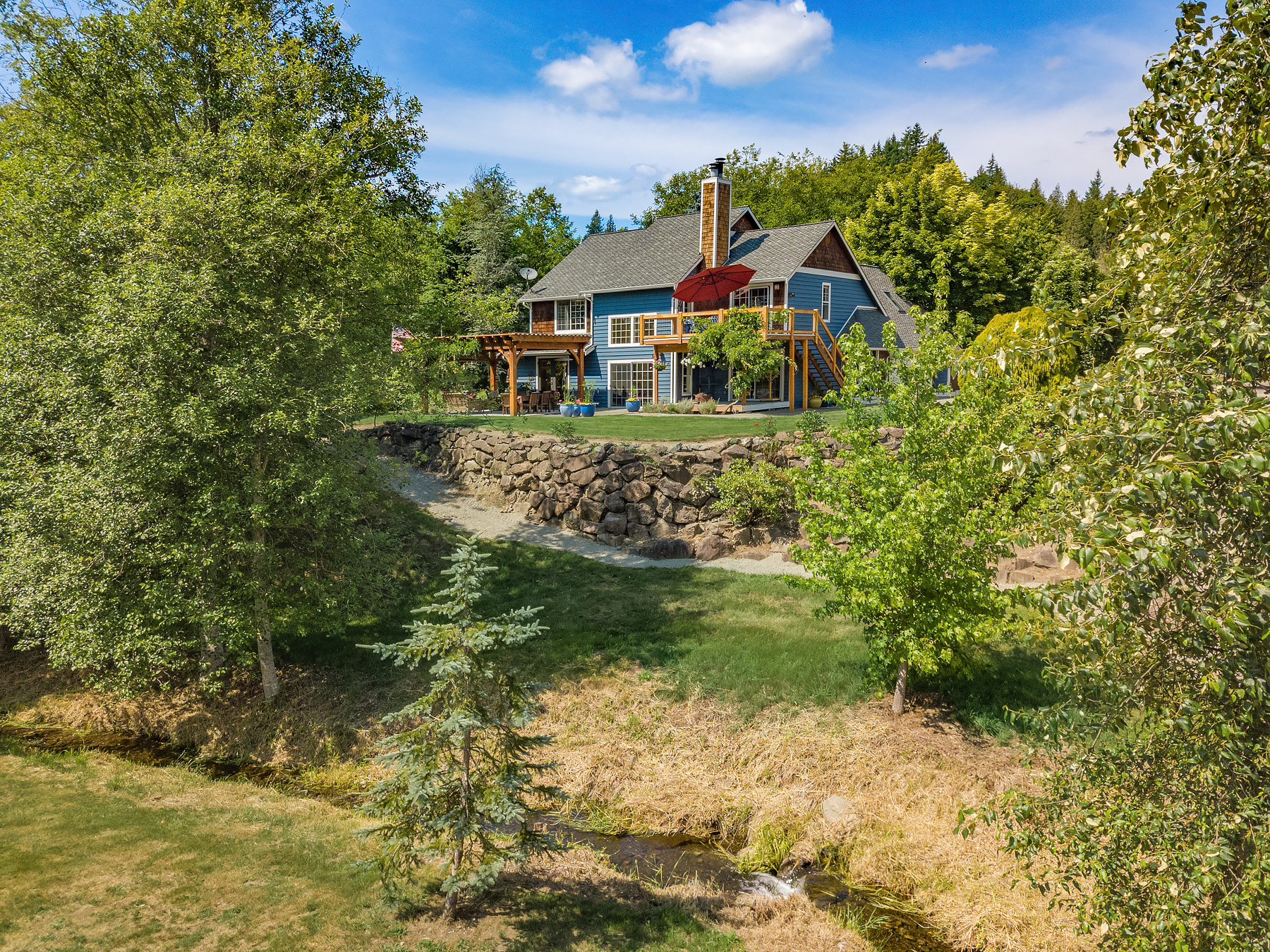 Rockin SJ Arena. Gorgeous Creekside setting on nearly 15 acres. Treasured custom home sited to perfection offering lovely territorial vistas. Granite kitchen with adjoining dining space, French Doors lead to covered outdoor living space. Primary Suite with 3/4 bath, private deck with sitting room and rock fireplace. Dedicated garden area, sprawling lawns and a tremendous fully fenced dog yard with covered kennels. Enjoy multiple fenced pastures, 120×280 lighted outdoor sand arena, 5 stall capacity barn with tack room and full-length loft. Large shop with crane lift, mezzanine storage and 220 amp power. Tranquil Creekside living with walking bridge, thoughtfully designed property offering privacy and function all in one.
