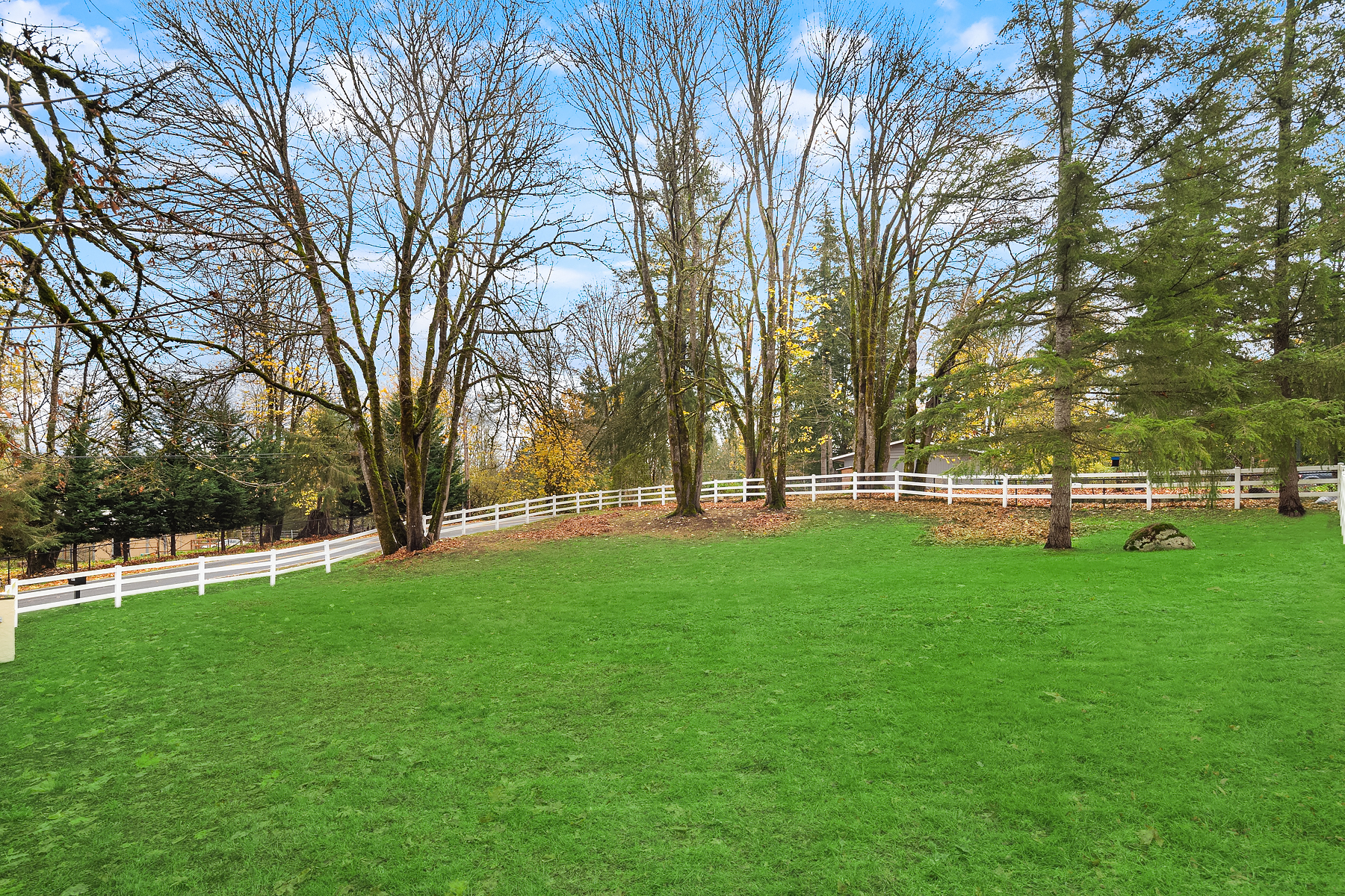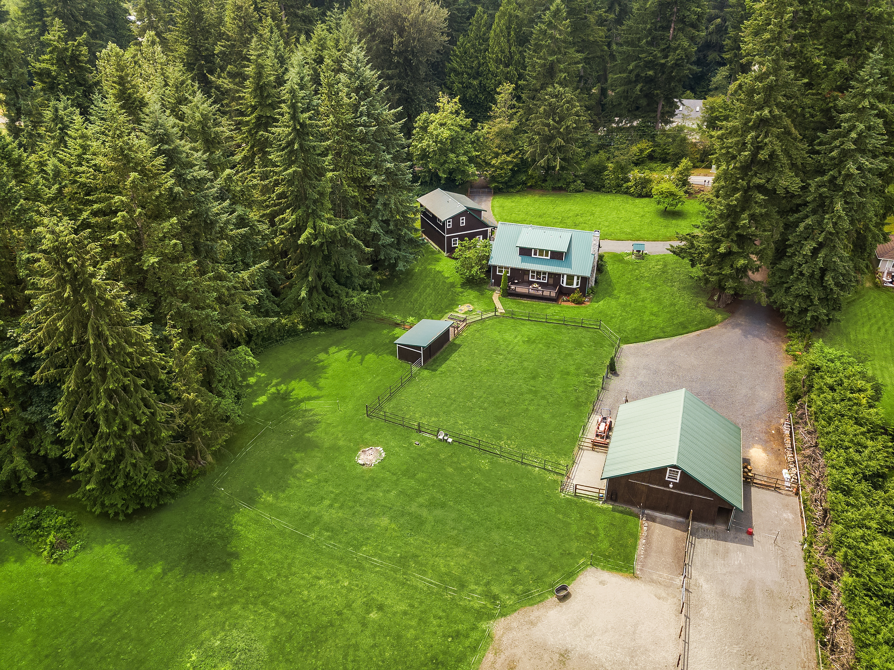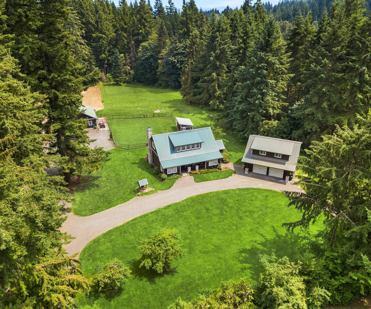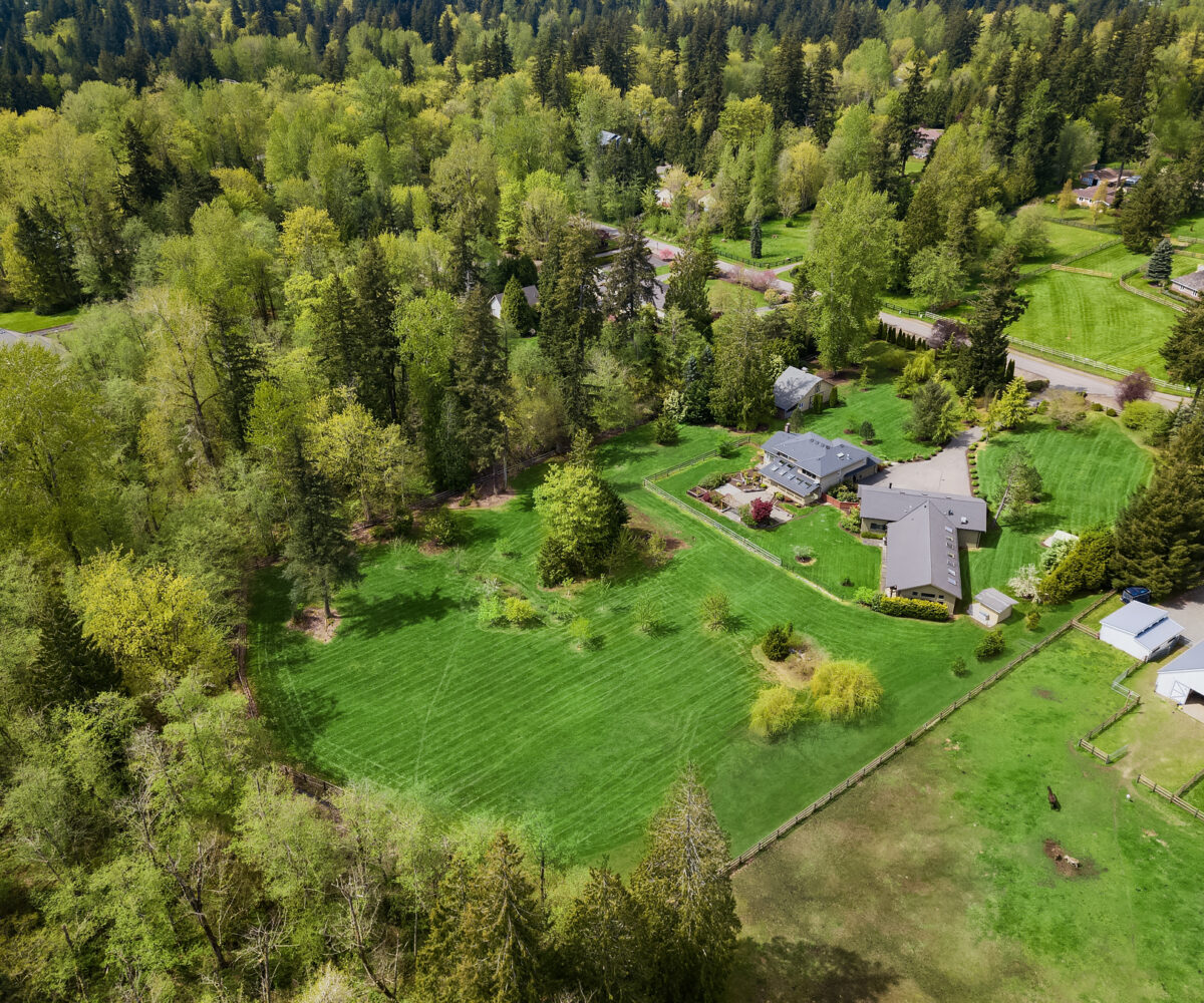 On the Park at Pikes Peak, Bridle Trails. A timeless Northwest design blends harmoniously on this 1 acre setting. Floor to ceiling window walls allow the outside in with a forested backdrop and uncompromised privacy. Sensational style with rich finishes, wood beamed ceilings and unique spaces throughout the home making this property one of a kind. Sprawling lawns, parked out grounds and 3 stall barn with tack room and fenced paddock. Idyllic location down a quiet dead end street and direct trail access from your property. Enjoy a tour of the home: https://my.matterport.com/show/?m=MkucD8LBhqq